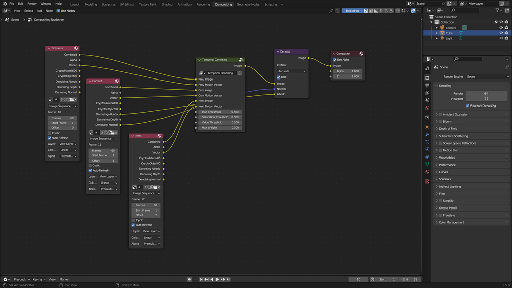 Blender compositing node group for temporal denoising of animations.